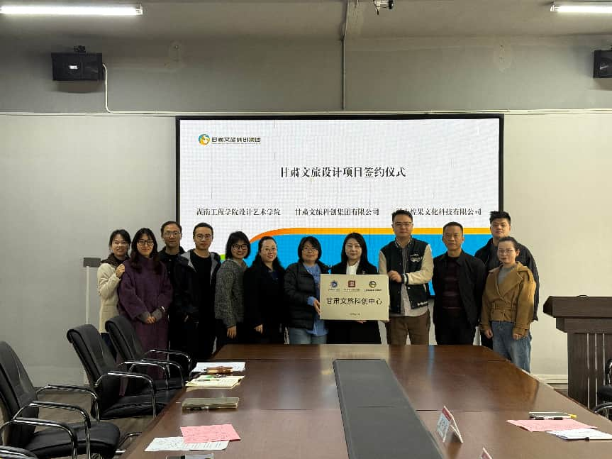为深化产教融合、推动校地校企协同创新,4 月 3 日上午,甘肃文旅设计项目签约仪式在湖南工程学院设计艺术学院 201 会议室圆满举行。甘肃文旅科创集团有限公司、湖南煌果文化科技有限公司与湖南工程学院设计艺术学院达成战略合作,共同签署框架合作协议。